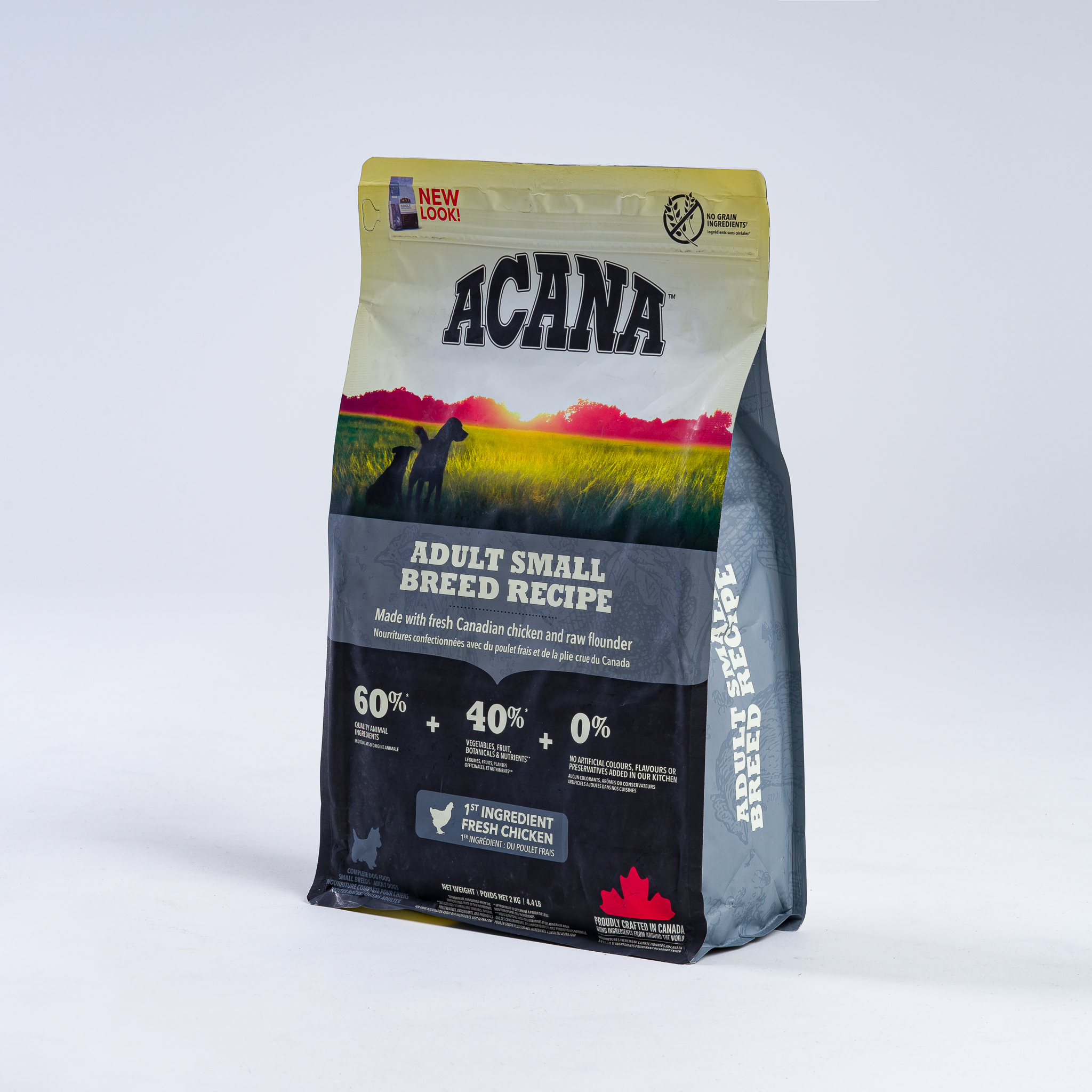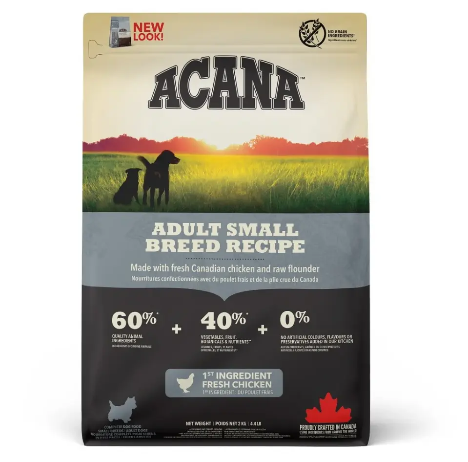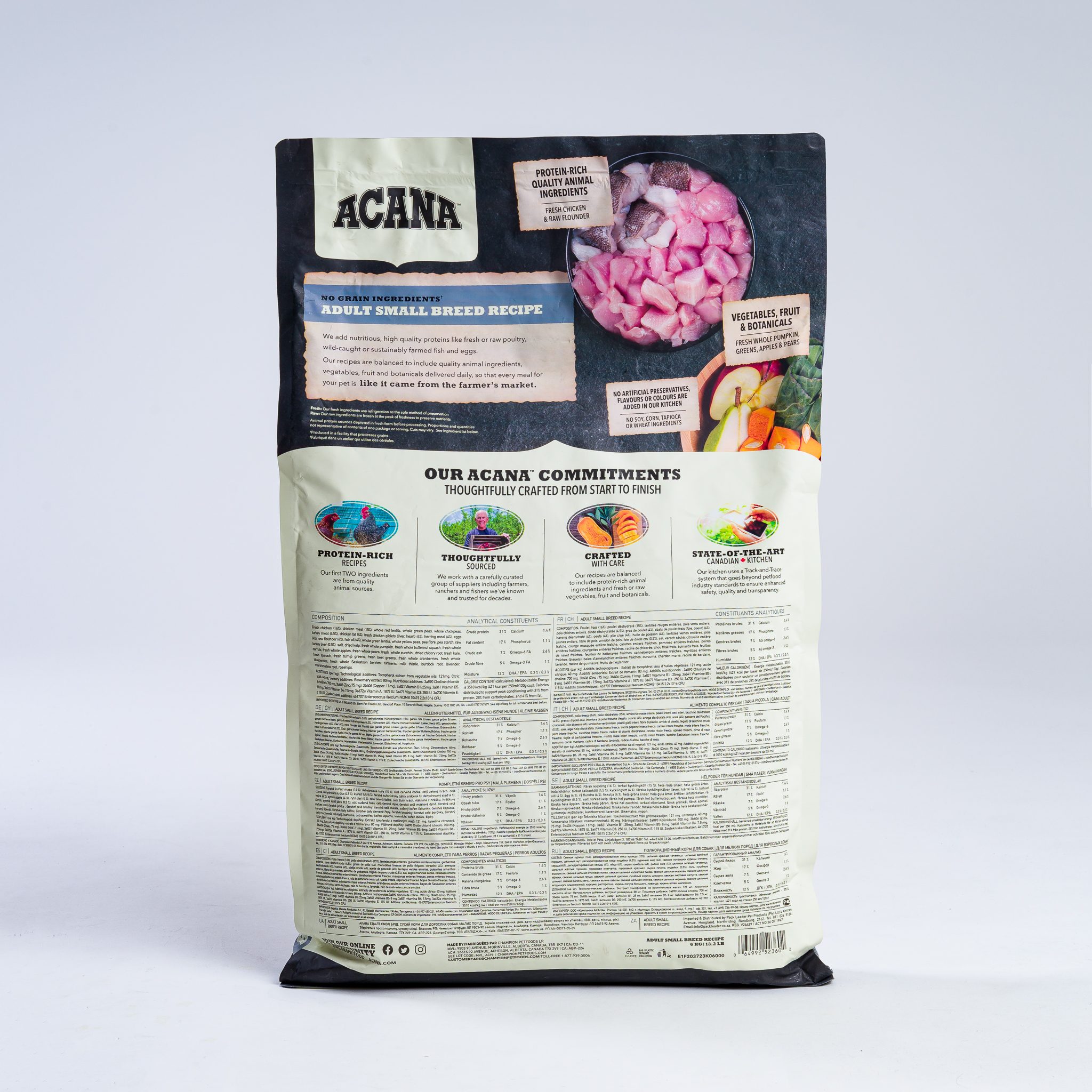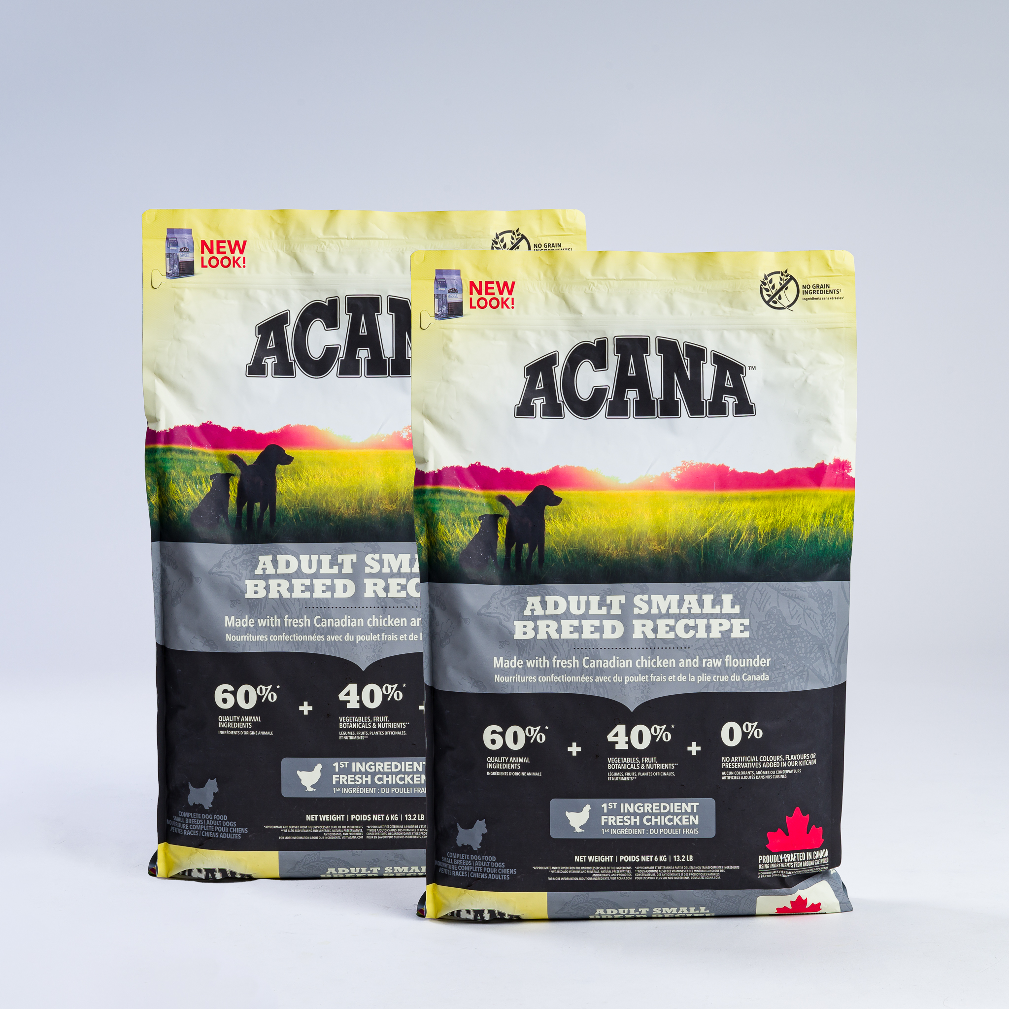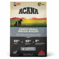 ACANA® Adult Small Breed Recipe is thoughtfully crafted to nurture your small dog from start to finish. Rich with 60% quality animal ingredients like fresh Canadian chicken and raw flounder balanced with 40% fruit, vegetables & botanicals, this recipe provides the protein and nutrition your small breed dog needs.
