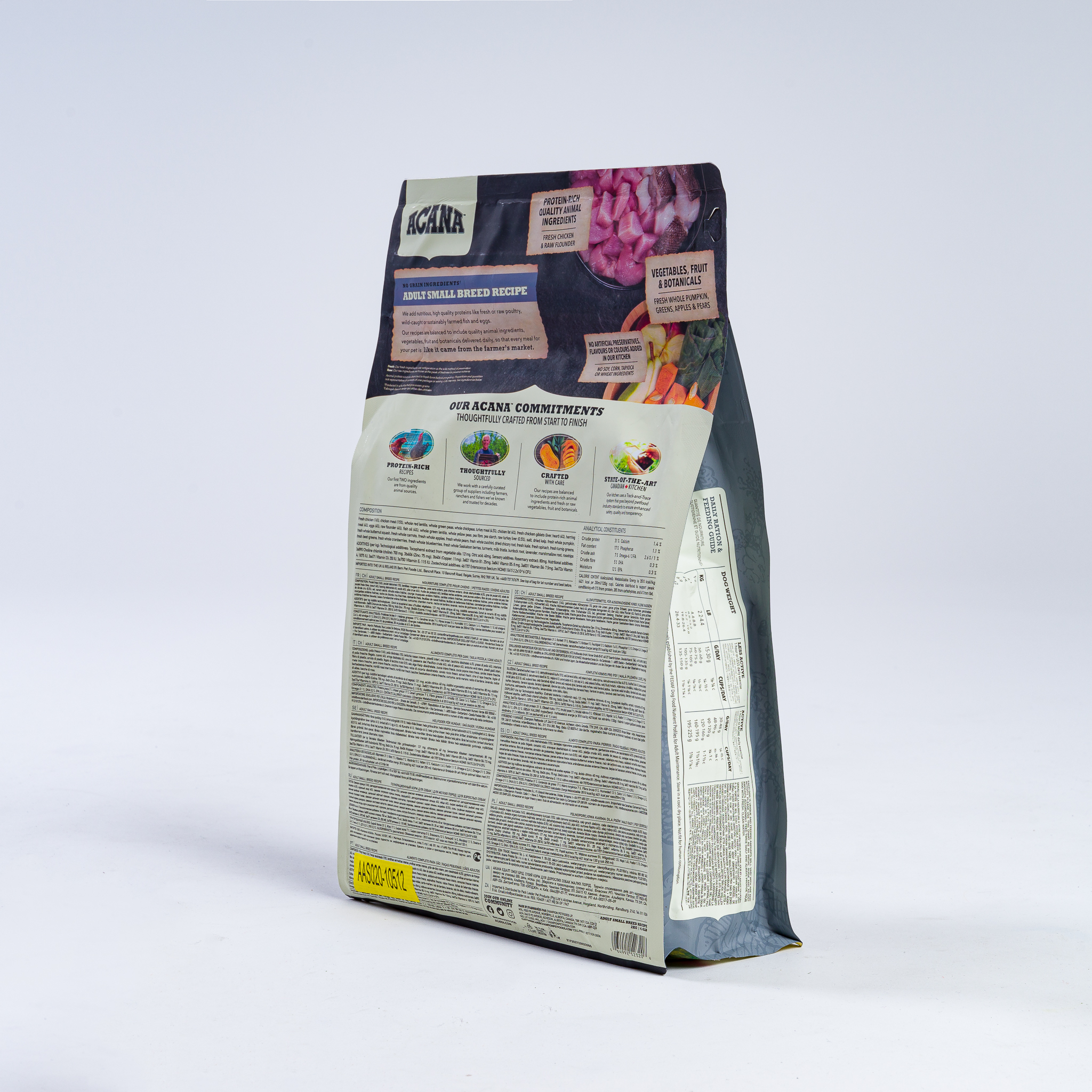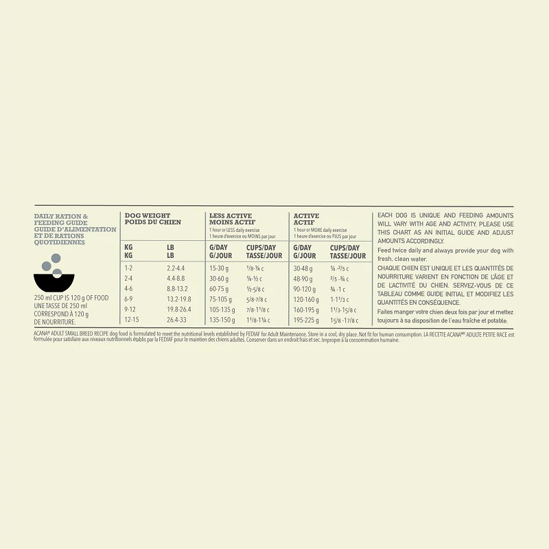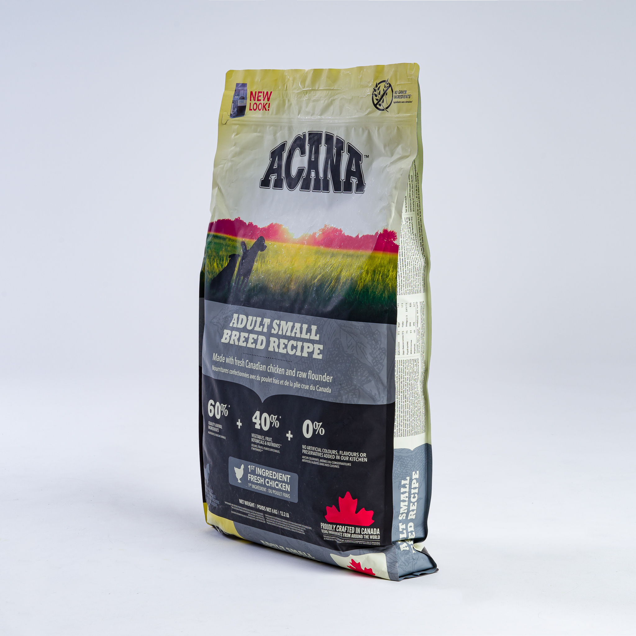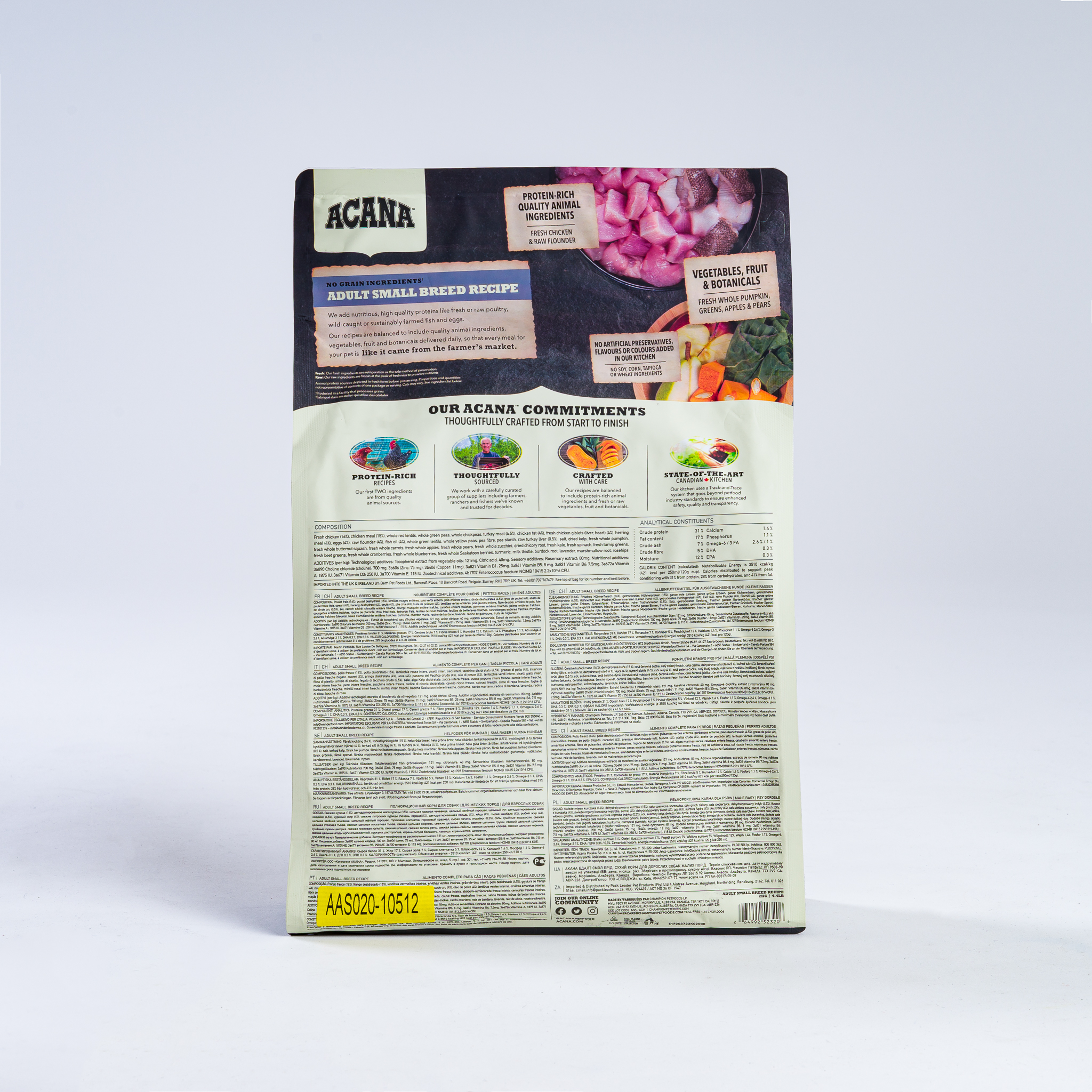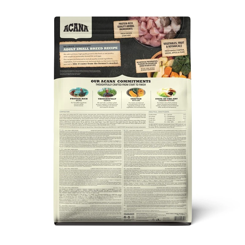 ACANA® Adult Small Breed Recipe is thoughtfully crafted to nurture your small dog from start to finish. Rich with 60% quality animal ingredients like fresh Canadian chicken and raw flounder balanced with 40% fruit, vegetables & botanicals, this recipe provides the protein and nutrition your small breed dog needs.