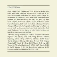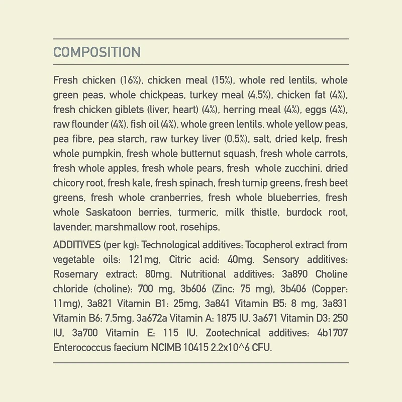 Fresh chicken (16%), chicken meal (15%), whole red lentils, whole green peas, whole chickpeas, turkey meal (4.5%), chicken fat (4%), fresh chicken giblets (liver, heart) (4%), herring meal (4%), eggs (4%), raw flounder (4%), fish oil (4%), whole green lentils, whole yellow peas, pea fibre, pea starch, raw turkey liver (0.5%), salt, dried kelp, fresh whole pumpkin, fresh whole butternut squash, fresh whole carrots, fresh whole apples, fresh whole pears, fresh whole zucchini, dried chicory root, fresh kale, fresh spinach, fresh turnip greens, fresh beet greens, fresh whole cranberries, fresh whole blueberries, fresh whole saskatoon berries, turmeric, milk thistle, burdock root, lavender, marshmallow root, rosehips.