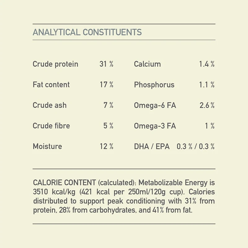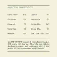Crude protein 31%, Fat content 17%, Crude ash 7%, Crude fiber 5%, Moisture 12%, Calcium 1.4%, Phosphorus 1.1%, Omega-3 fatty acids 1%, Omega-6 fatty acids 2.6%, DHA (docosahexaenoic acid) 0.3%, EPA (eicosapentaenoic acid) 0.3%,