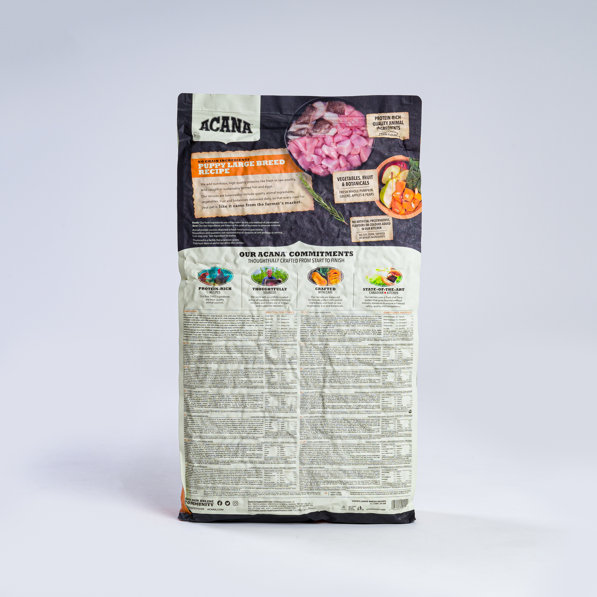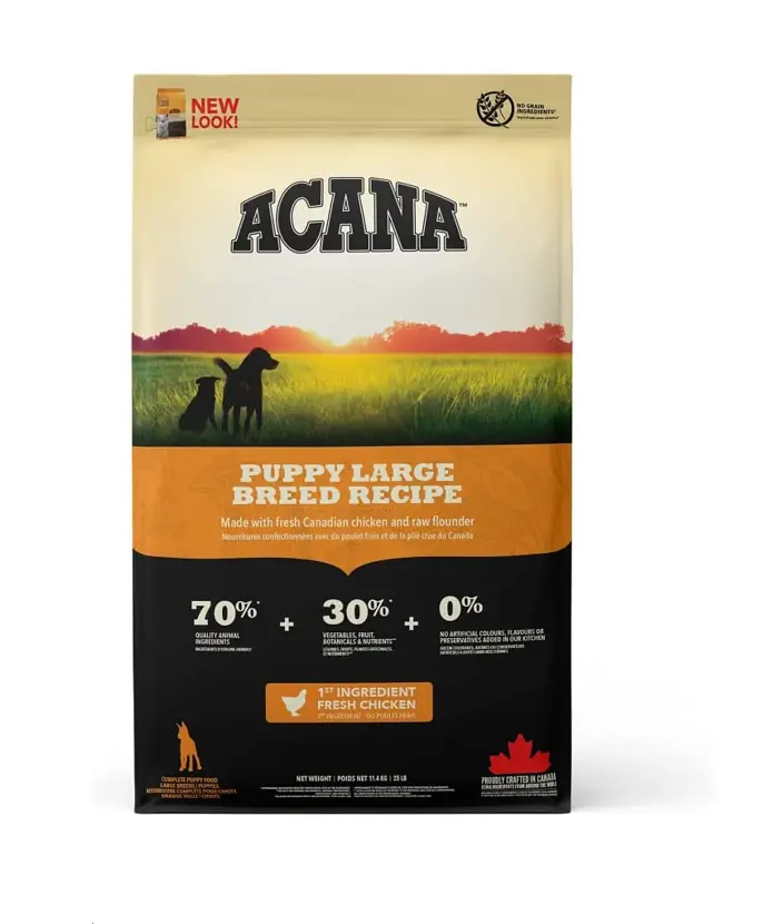 ACANA® Puppy Large Breed Recipe is thoughtfully crafted to nurture growing puppies of all breeds. Rich with 70% quality animal ingredients like fresh Canadian chicken and raw flounder balanced with 30% fruit, vegetables & botanicals, this recipe is specially formulated to provide your growing large to giant breed puppy with the protein and nutrition they need to support their rapid development.