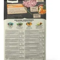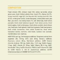 Fresh chicken (22%), chicken meal (21%), whole red lentils, whole green peas, fresh chicken giblets (liver, heart) (6%), herring meal (4%), eggs (4%), raw flounder (4%), fish oil (4%), whole chickpeas, pea fibre, pea starch, turkey meal (2.5%), whole green lentils, whole yellow peas, chicken fat (2%), raw turkey livers (0.5%), salt, dried kelp, fresh whole apples, fresh whole butternut squash, fresh whole carrots, fresh whole pears, fresh whole pumpkin, fresh whole zucchini, fresh kale, fresh spinach, fresh turnip greens, fresh beet greens, fresh whole blueberries, fresh whole cranberries, fresh whole saskatoon berries, burdock root, lavender, marshmallow root, milk thistle, rosehips, turmeric.
