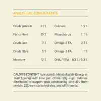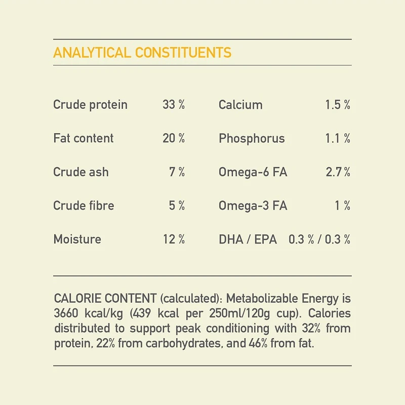 Crude protein 33%, Fat content 15%, Crude ash 7%, Crude fiber 6%, Moisture 12%, Calcium 1.4%, Phosphorus 1.0%, Omega-3 fatty acids 1.2%, Omega-6 fatty acids 2.4%, DHA (docosahexaenoic acid) 0.4%, EPA (eicosapentaenoic acid) 0.4%,