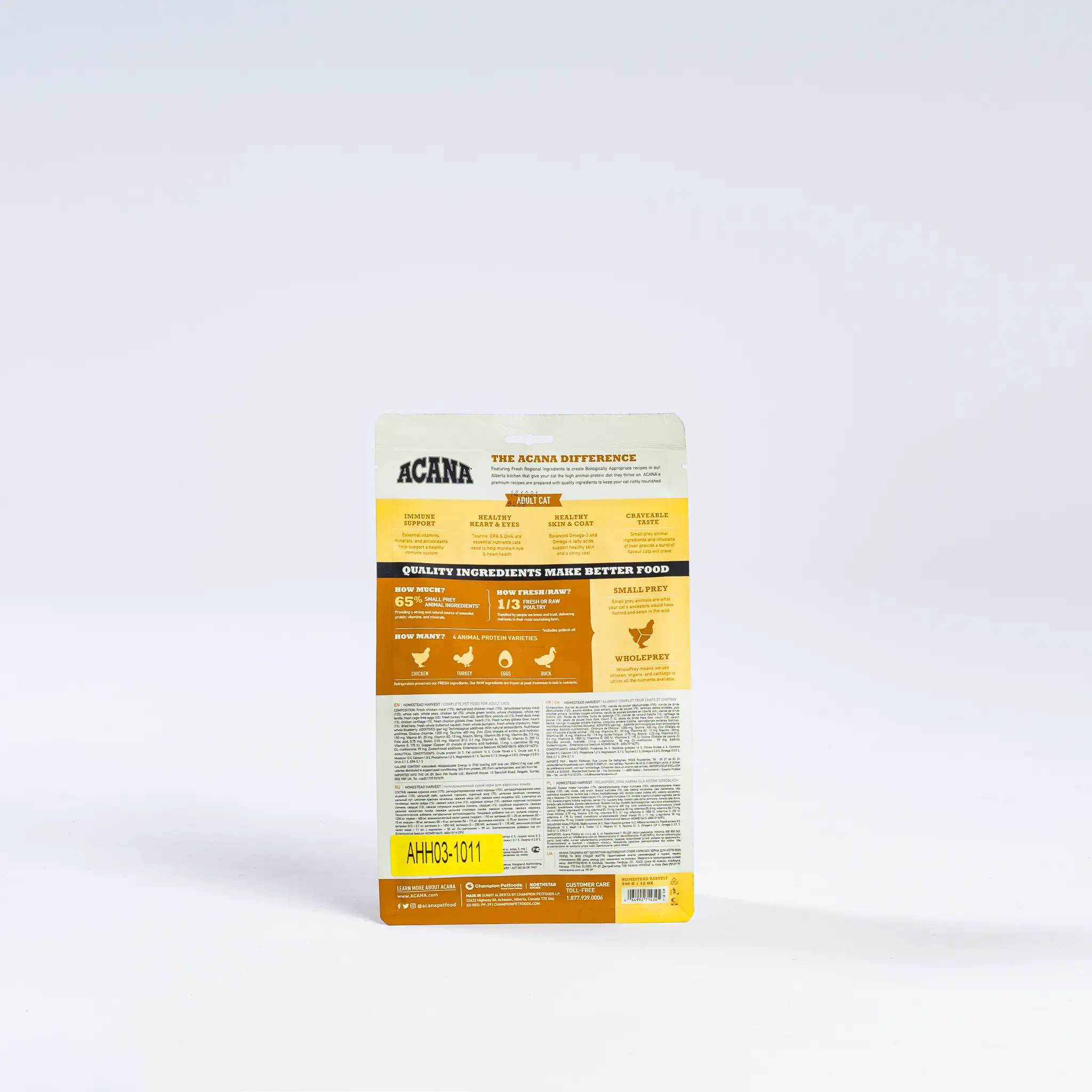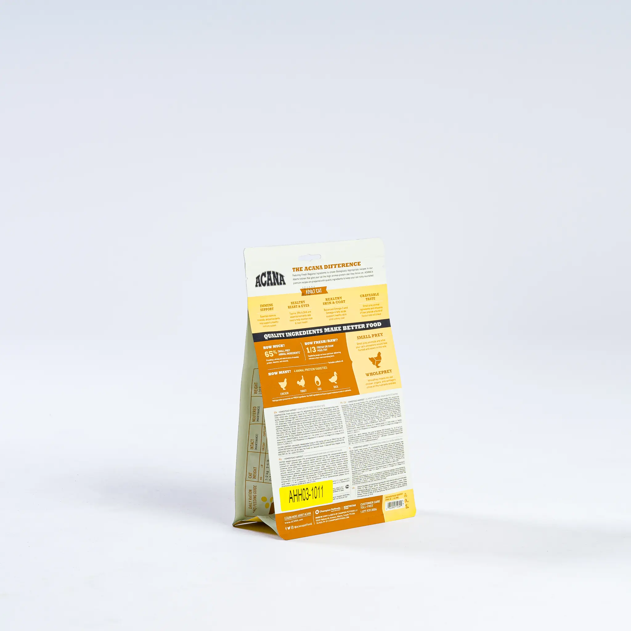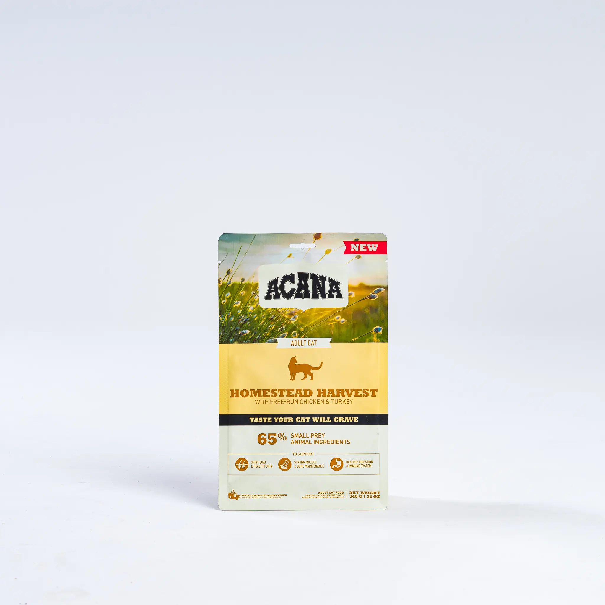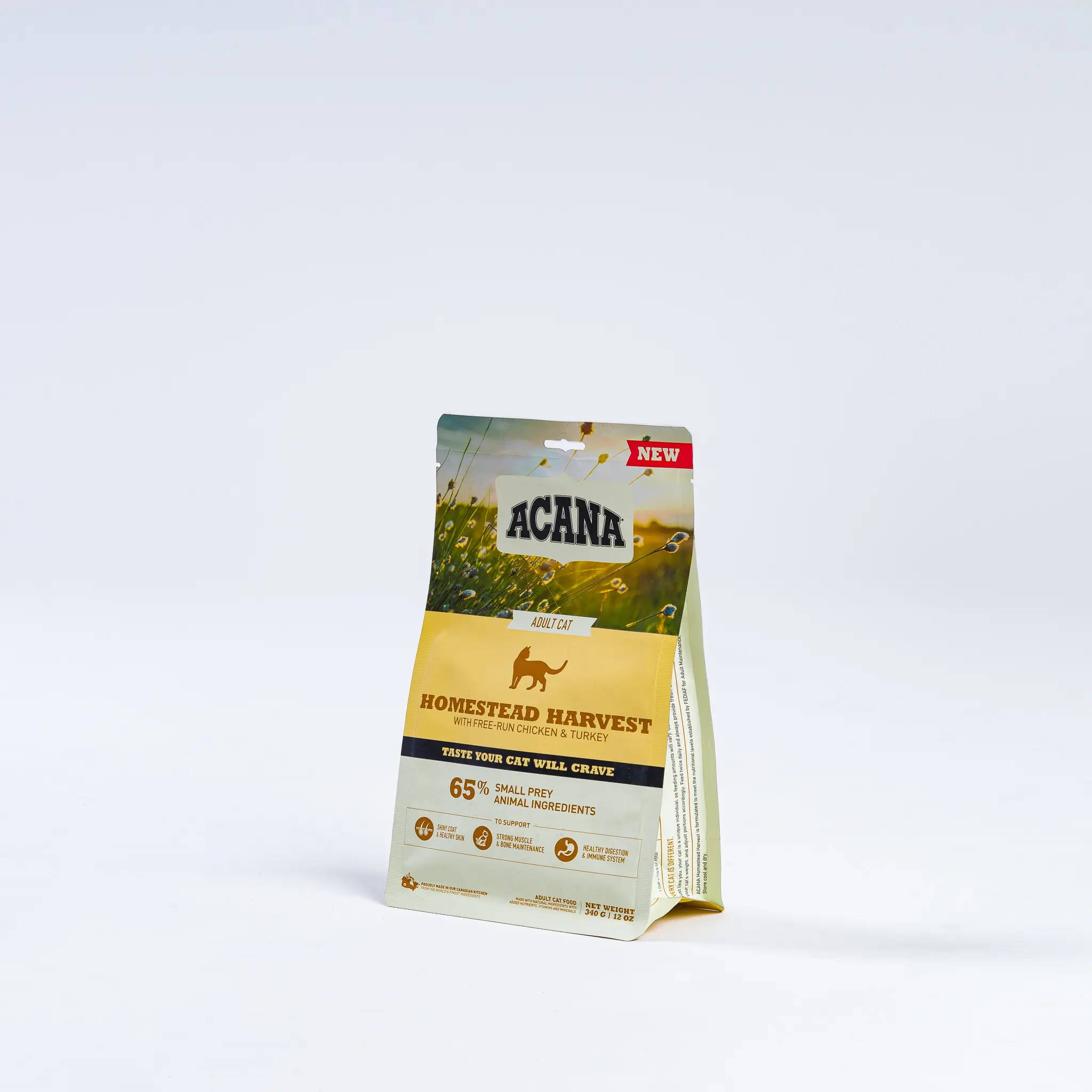 ACANA® Homestead Harvest features fresh 65% small prey animal ingredients, 1/3 fresh or raw, cage-free chicken, turkey, duck and eggs. The remainder of this formula is filled with 35% fruits, botanicals, and vegetables such as blueberries and butternut squash. Essential vitamins, minerals, and antioxidants support digestive and immune health. Additionally, the taurine, EPA, and DHA work to maintain eye and heart health, and the omega fatty acids will make your cat’s skin and coat shiny.
