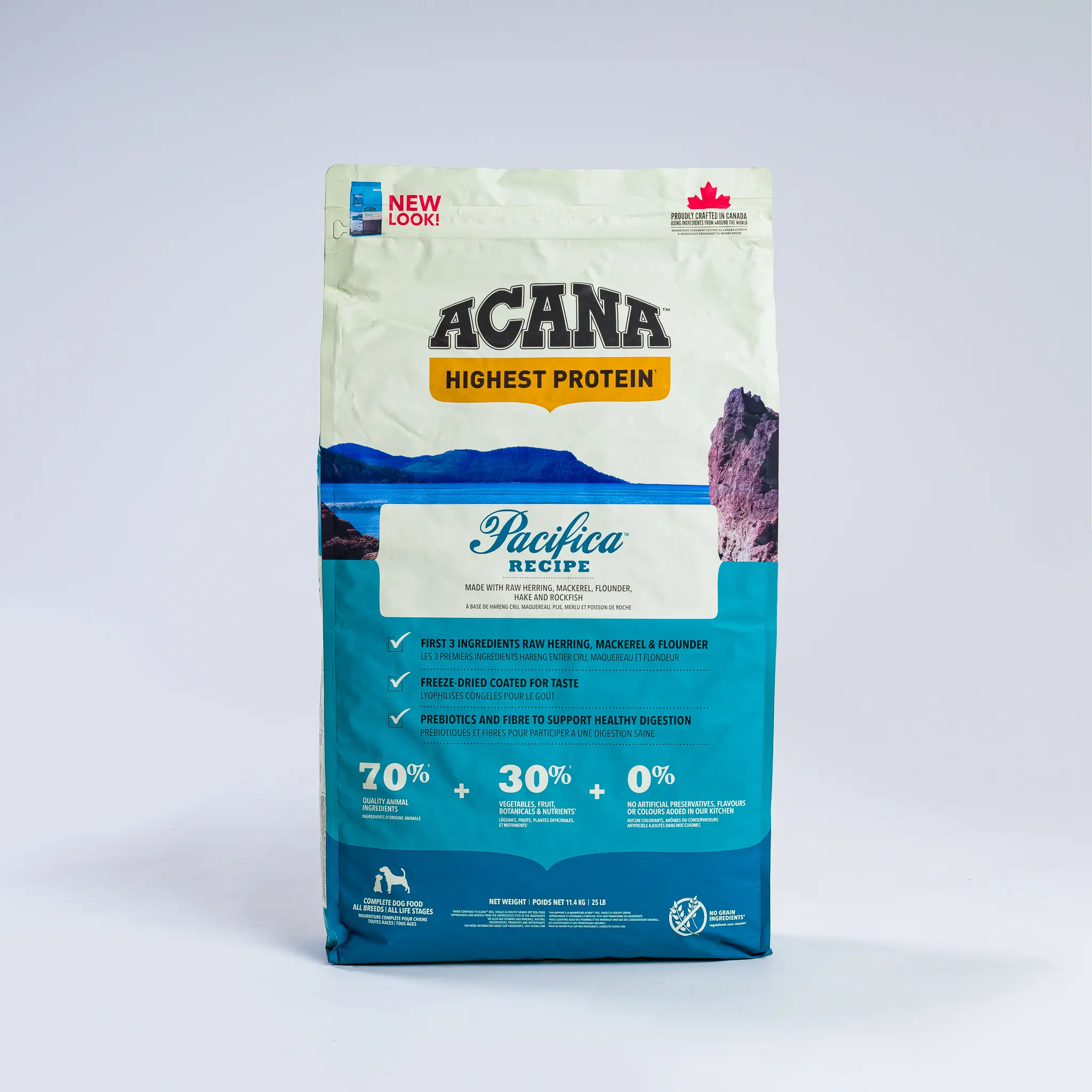 With the highest protein offering in ACANA® pet foods, this recipe is rich with 70% quality animal ingredients like whole mackerel, herring, rockfish, hake, and flounder, balanced with 30% fruits, vegetables, and botanicals, many delivered daily. Artificial colours, flavours or preservatives are never added.