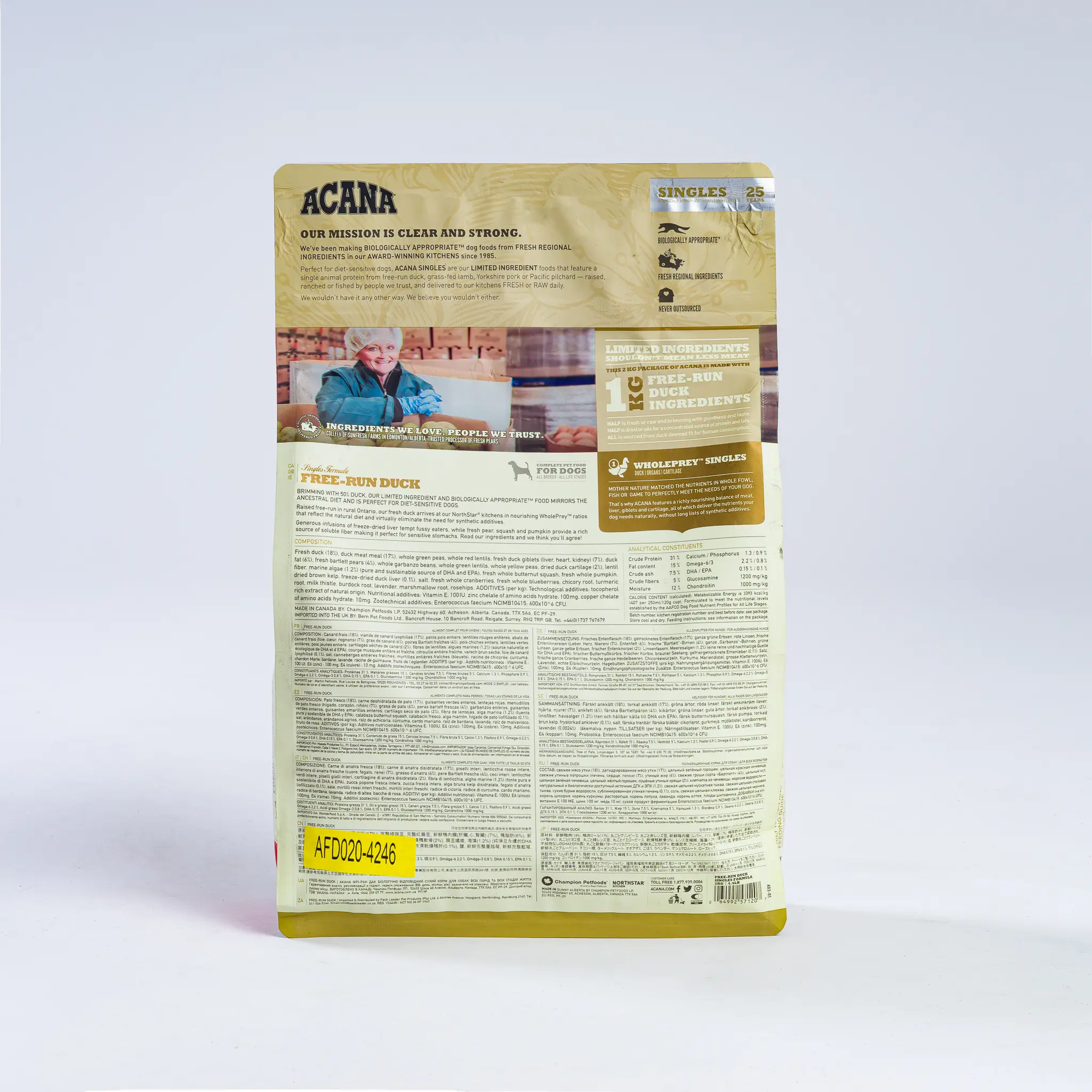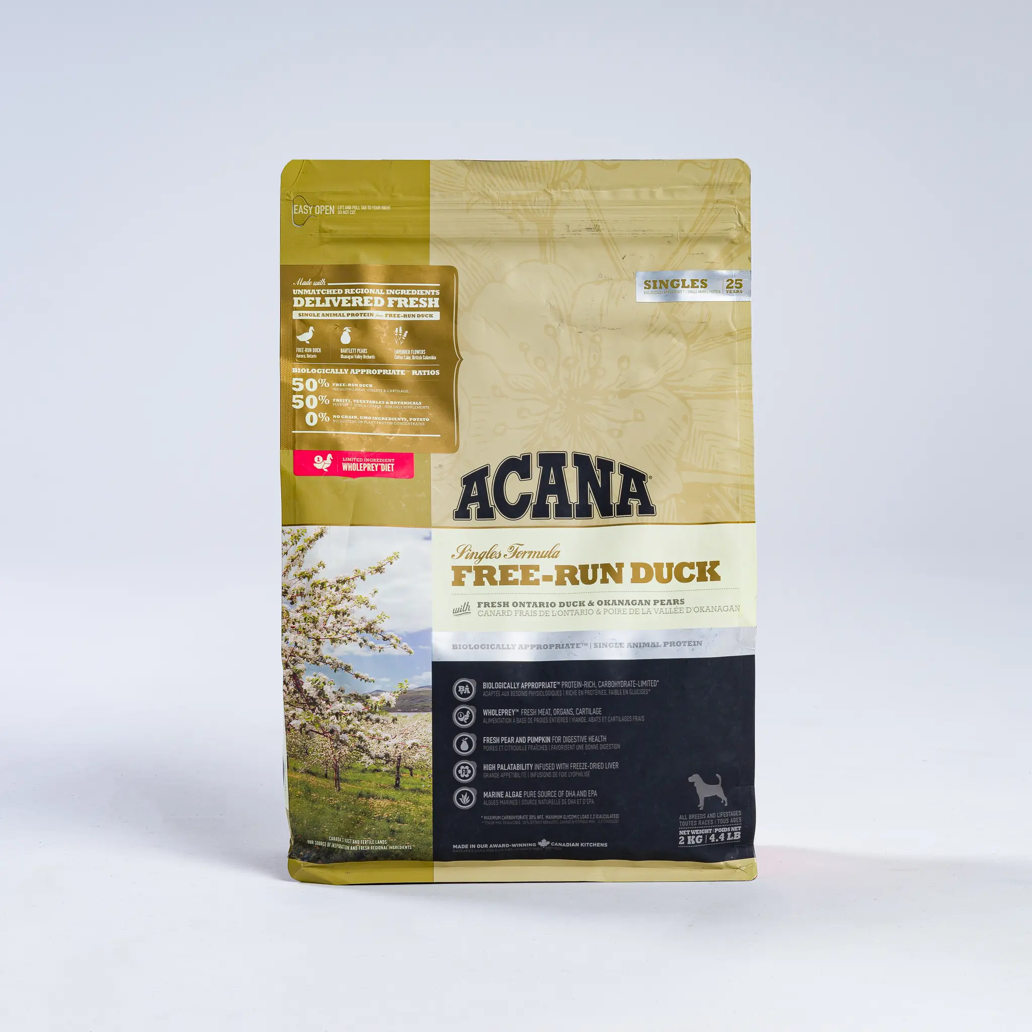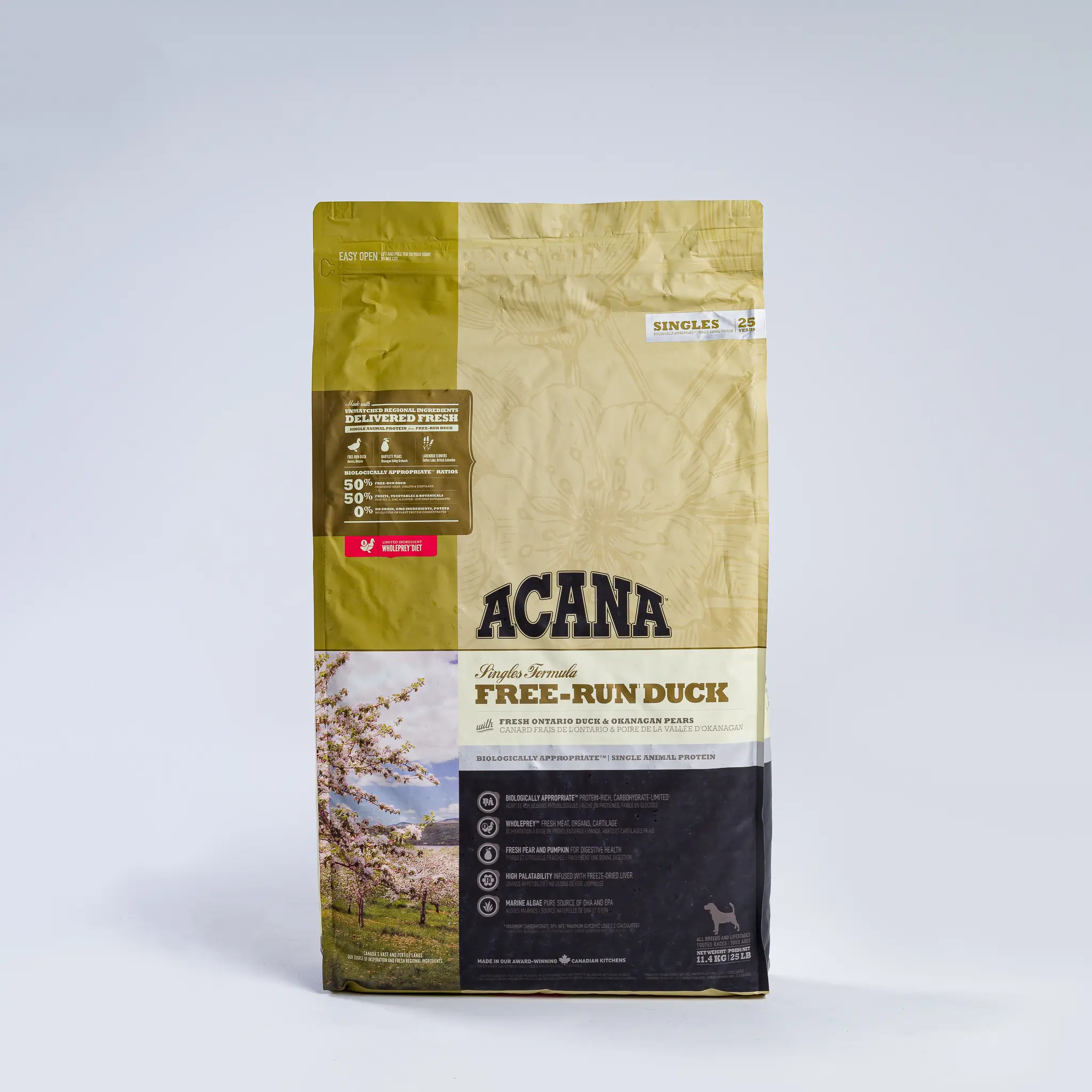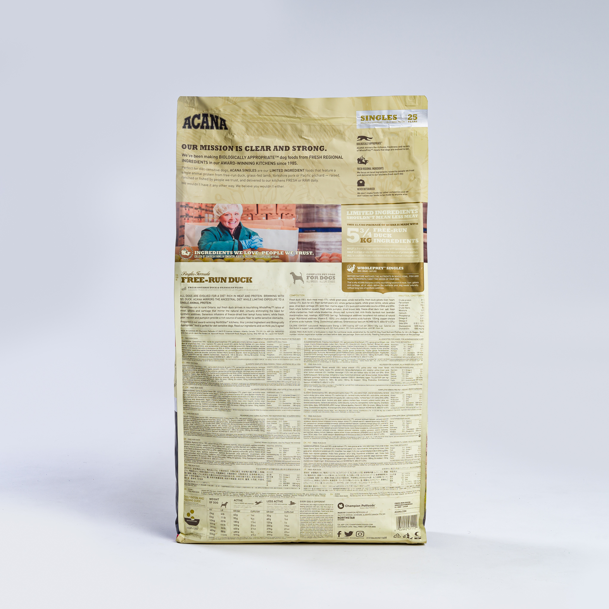 Dogs truly are man’s best friend, so why not feed them the very best? ACANA® Singles Free-Run Duck Dog Food is the ultimate dish-for-one, packed with all of the protein and nutrients your beloved pet needs to look and feel their best. Alongside a delicious helping of quality free-run duck, this exclusive Acana dog food also contains sweet Bartlett pears and a blend of natural ingredients. Free from grain, these mouthwatering chunks of heaven are a treat for any lucky sidekick.