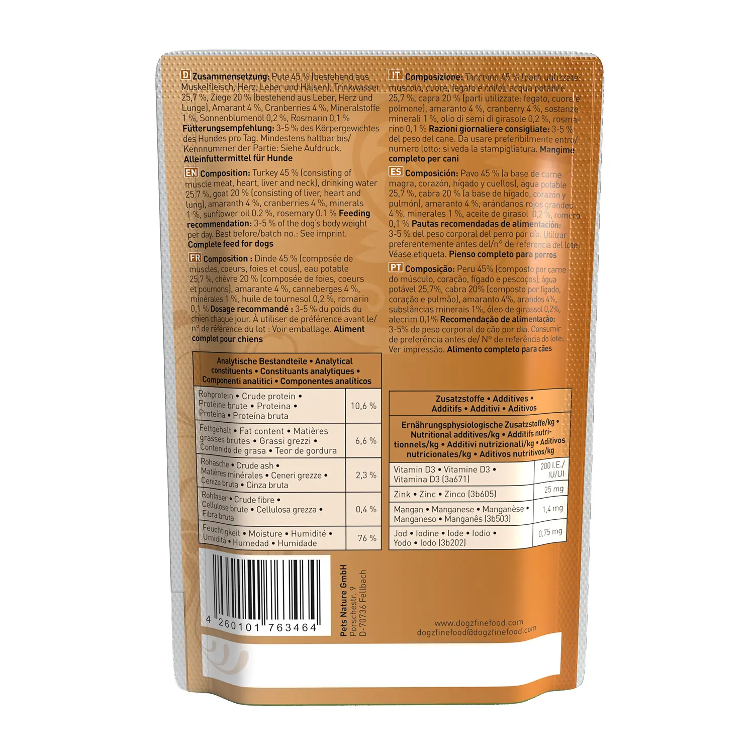 A grain-free wet food for nutritionally sensitive dogs with a high percentage of delicious turkey and goat and valuable ingredients such as amaranth, rosemary and cranberry. Guaranteed without preservatives, flavor enhancers or artificial colors and, of course, GMO-free.