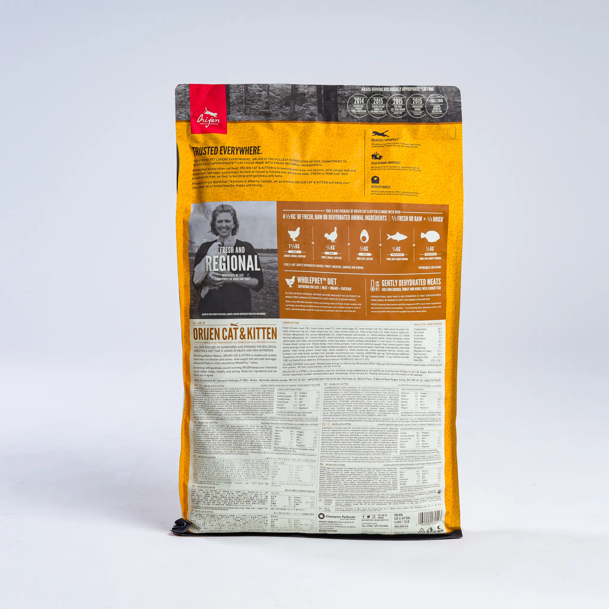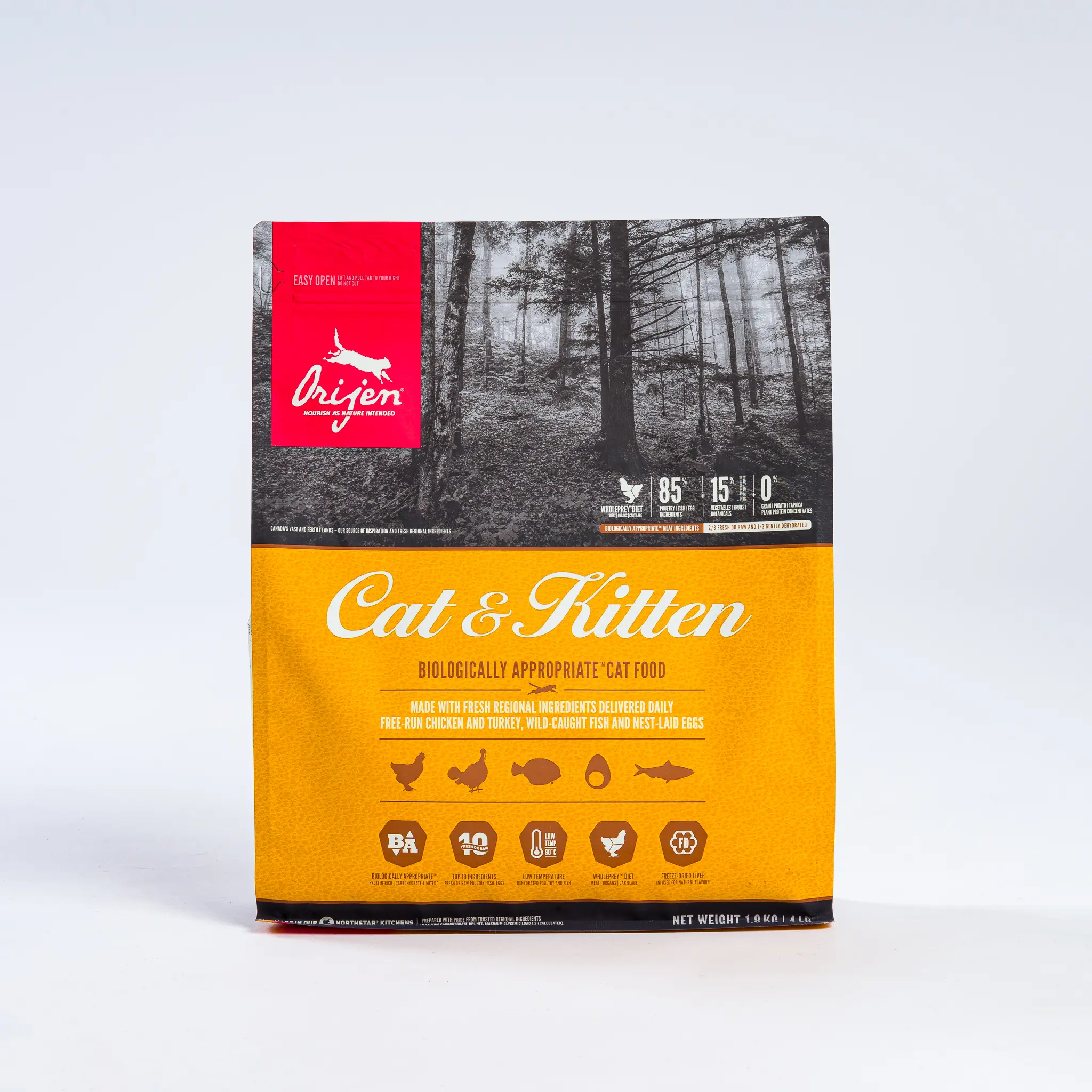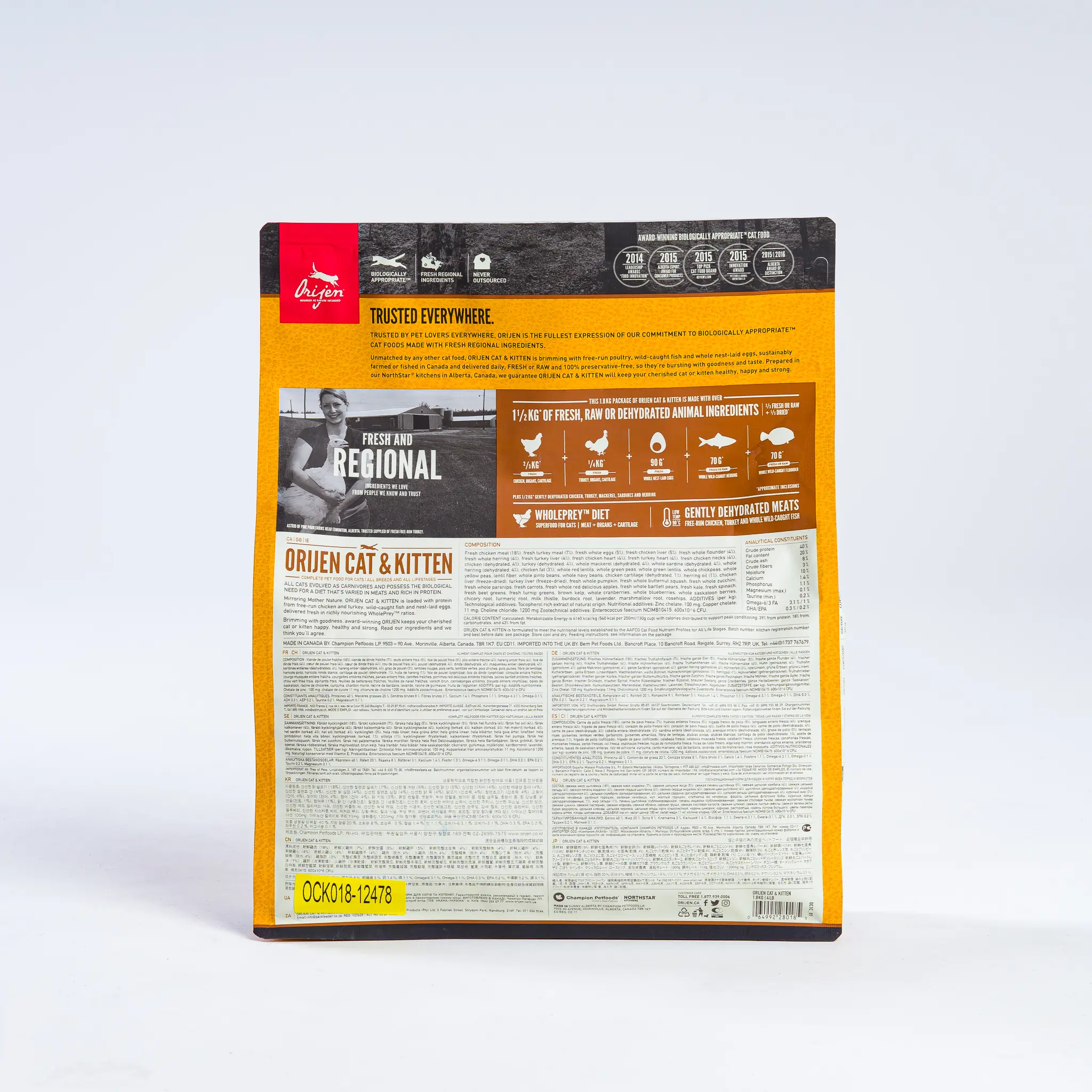 ORIJEN® Cat & Kitten diet is made with fresh or raw free-run chicken and turkey and wild-caught fish. Packed with WholePrey animal ingredients like poultry, fish, organs and bone, this food is made with the most nutrient-dense, succulent parts of the prey to deliver the nutrition cats need. With 85% quality animal ingredients and a freeze-dried liver coating, this diet is beyond comparison.