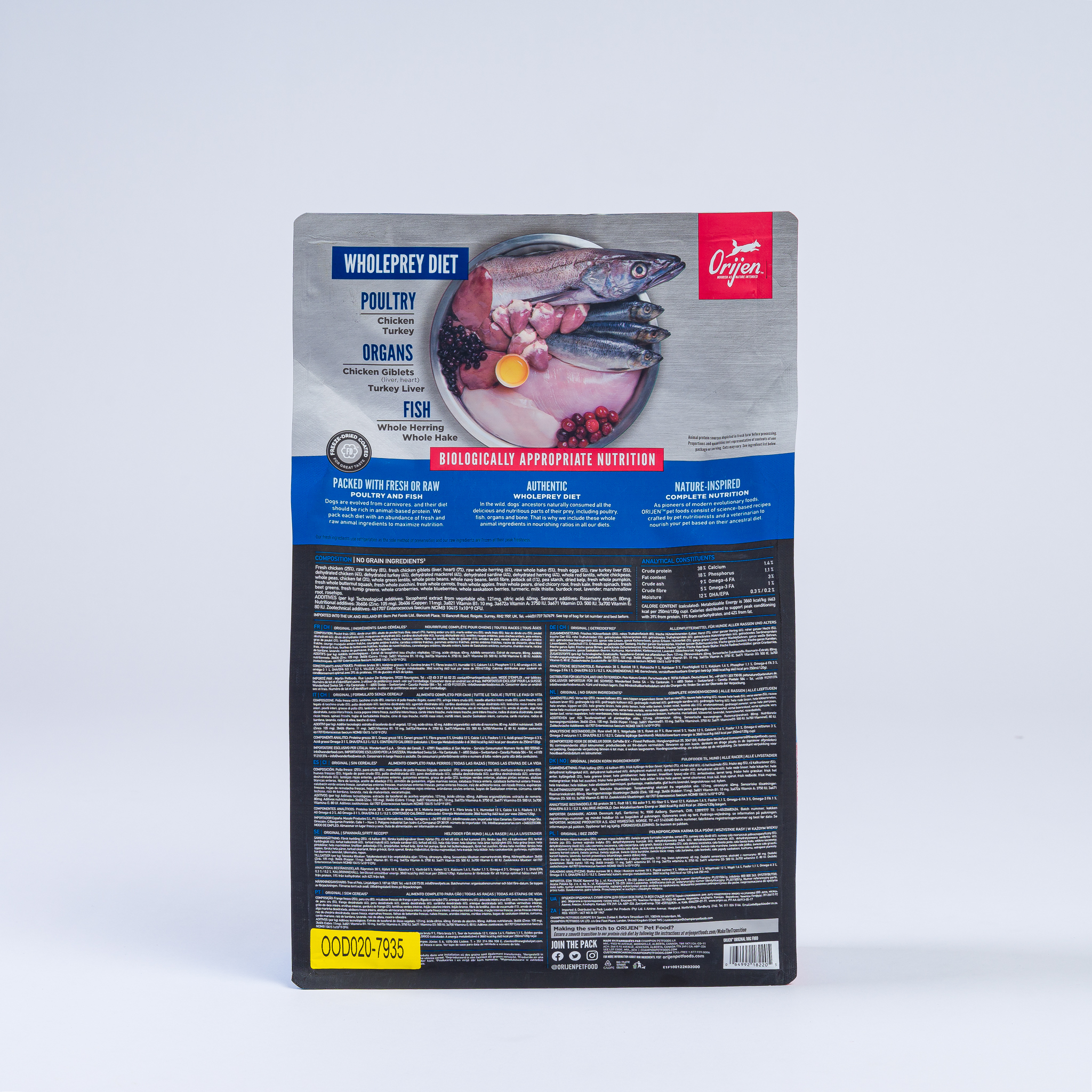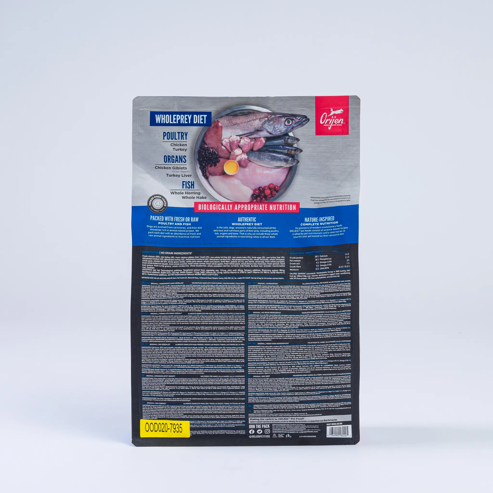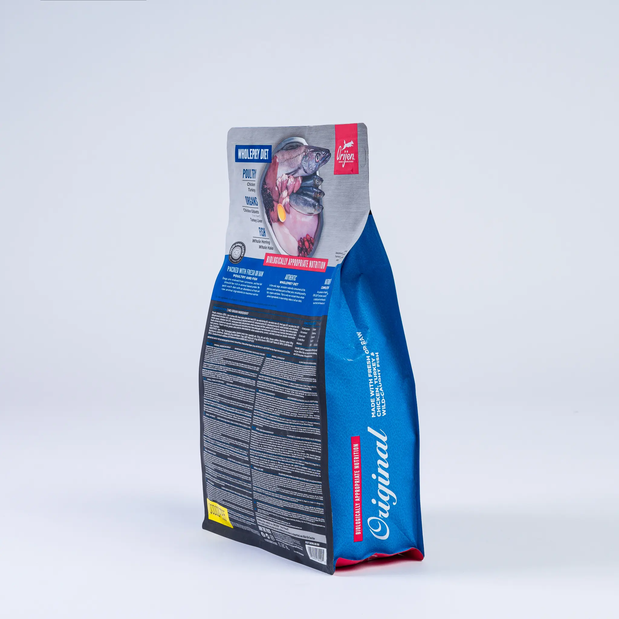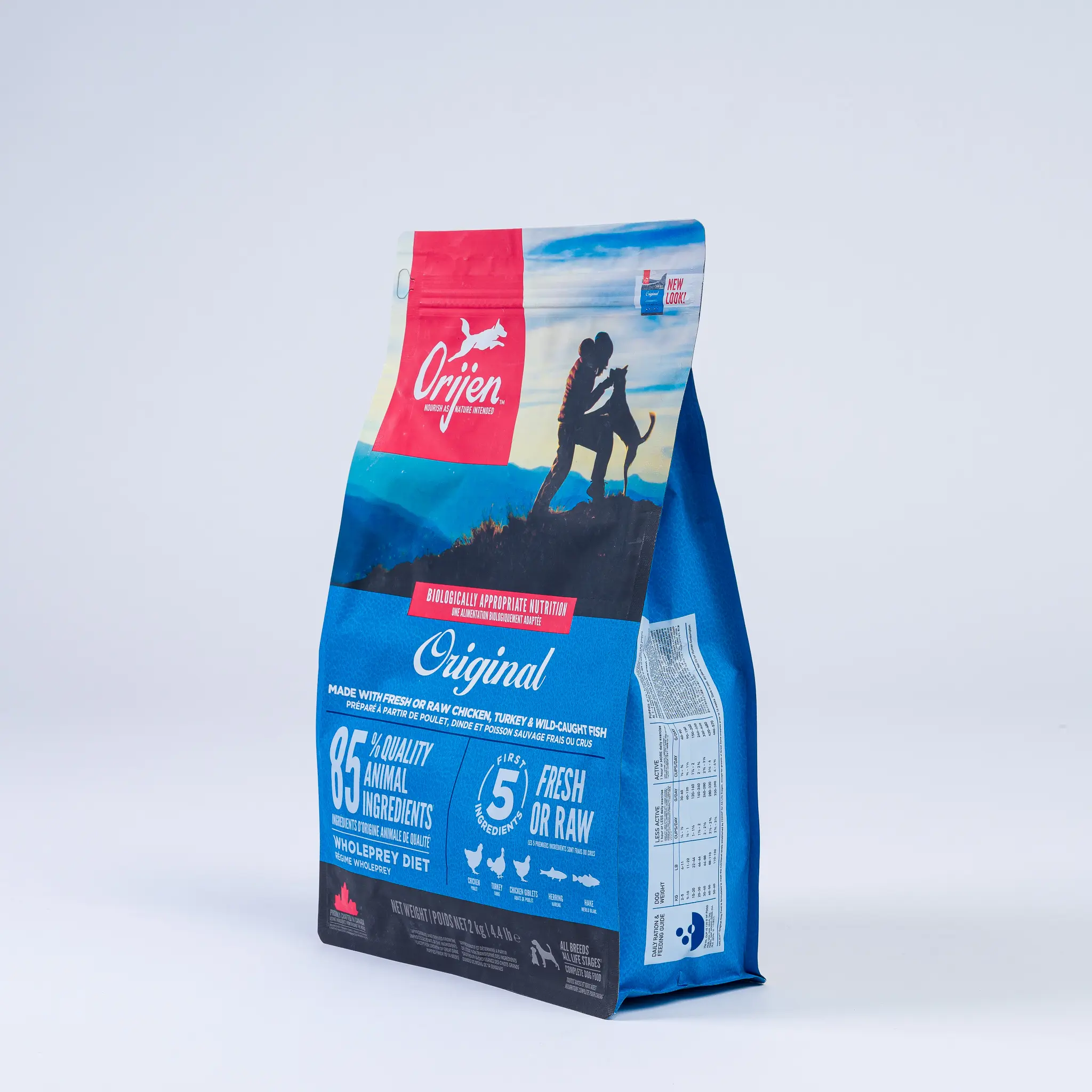 ORIJEN® Original diet is packed with 85% quality animal ingredients like fresh or raw free-run chicken and turkey, and wild-caught or sustainably farmed fish. Packed with WholePrey animal ingredients like organs and bone, this food is made with the most nutrient-dense, succulent parts of the prey to deliver the nutrition dogs need.