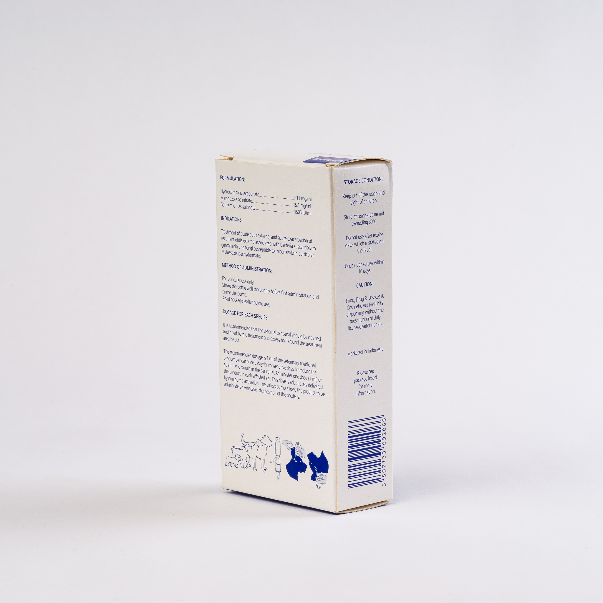 After application, the base of the ear may be massaged briefly and gently to allow the preparation to penetrate to the lower part of the of the ear canal. The product as presented allows treating a dog suffering from bilateral otitis. The veterinary medicinal product should be used at room temperature (i.e. do not instil cold product).